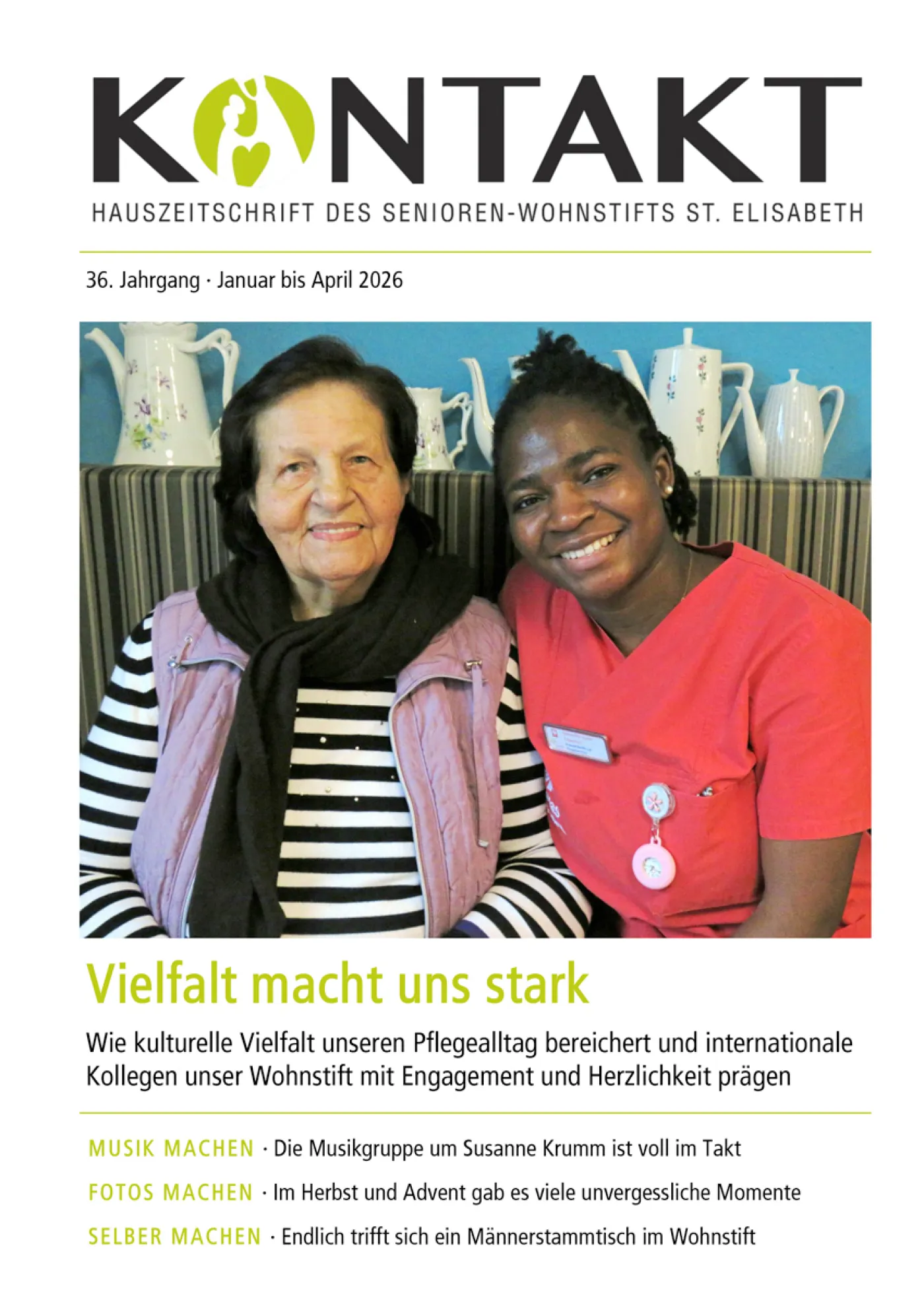 Die Hauszeitschrift des Senioren-Wohnstifts St. Elisabeth richtet sich an Bewohner, Angehörige und Mitarbeiter, aber auch Freunde des Hauses und alle an Altenpflege interessierten Menschen in Aschaffenburg und Umgebung. KONTAKT erscheint dreimal im Jahr und dreht sich ganz um das Wohnstift, seine Bewohner und Mitarbeiter.